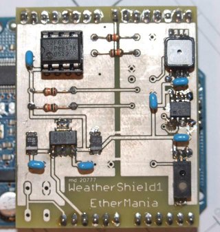 EtherMania WeatherShield1![]() Shield URL: WeatherShield1 The WeatherShield1 is able to read temperature, pressure and humidity values from the environment. It's equipped with a microcontroller that manages sampling and performs moving average on the last 8 samples. It's connected to the Arduino board though a synchronous bidirectional serial protocol similar to what was implemented in the MM5450 LED driver. Open Source: Unknown |