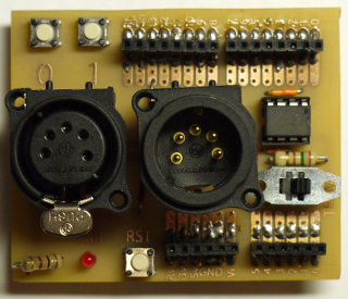 Shield with connectors to send and receive DMX512 signals for stage lighting control.