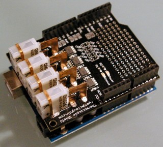 An Arduino shield designed to breakout the MAX6675 thermocouple to digital converter chip. This shield allows for interface to up to 4 K-type Thermocouples.