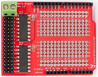 Renbotics Servo Shield![]() Shield URL: Servo Shield Uses two 4017 decade counters to drive up to 16 servos using only 4 pins (digital pins 6 to 9) and as little as one 8-bit timer (Timer 2) in standard mode or two 16/8-bit timers (Timer 1 and Timer 2 for Duemilanove or Timer 3 for Mega) in high accuracy mode. It also includes a 196 point breadboard style prototyping area. Open Source: |